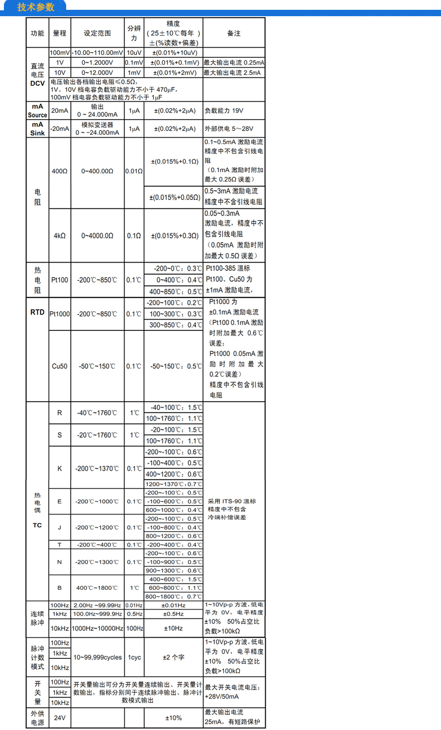 熱電阻(RTD:Pt100,Pt1000,Cu50 (支持4線制電阻輸出